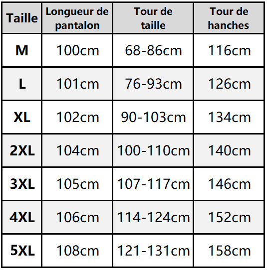 Taille : M, L, XL, 2XL, 3XL, 4XL