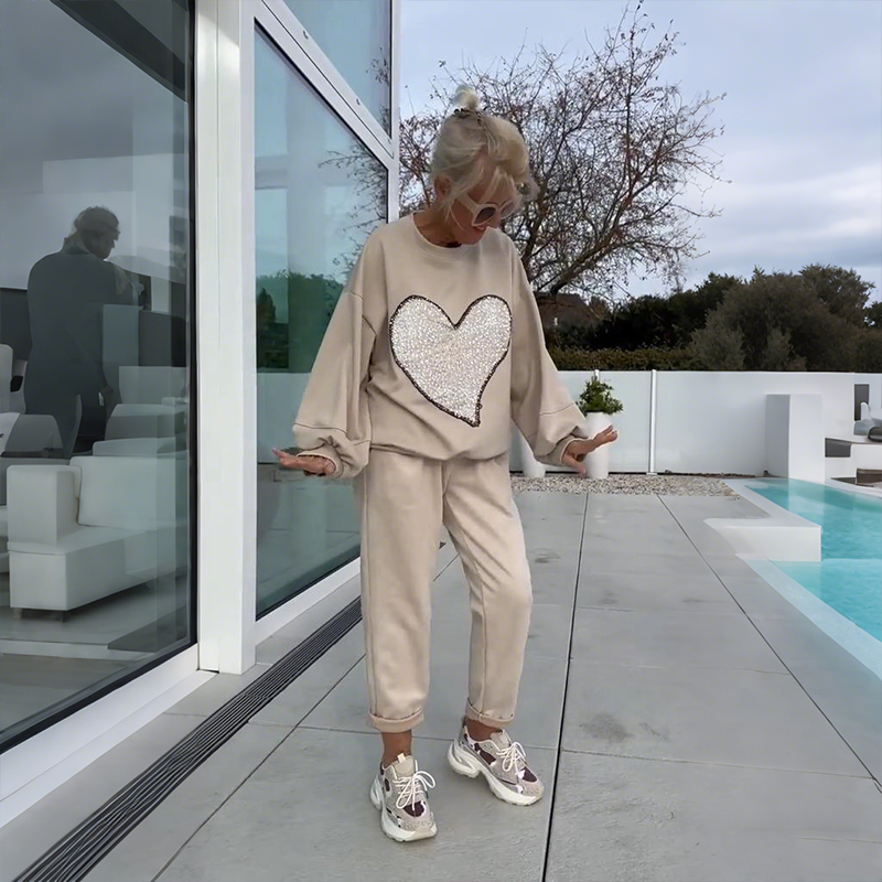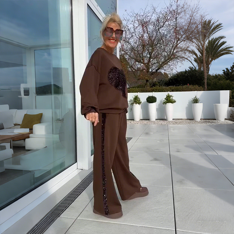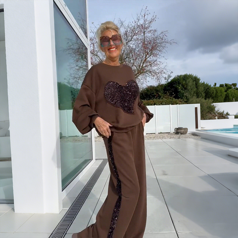 Ensemble deux pièces confortable et élégant composé d'un haut à paillettes scintillantes en forme de cœur et d'un pantalon ample. Confectionné dans un tissu haut de gamme doux et respirant, il offre confort, polyvalence et élégance au quotidien, pour se détendre ou sortir en toute décontraction.